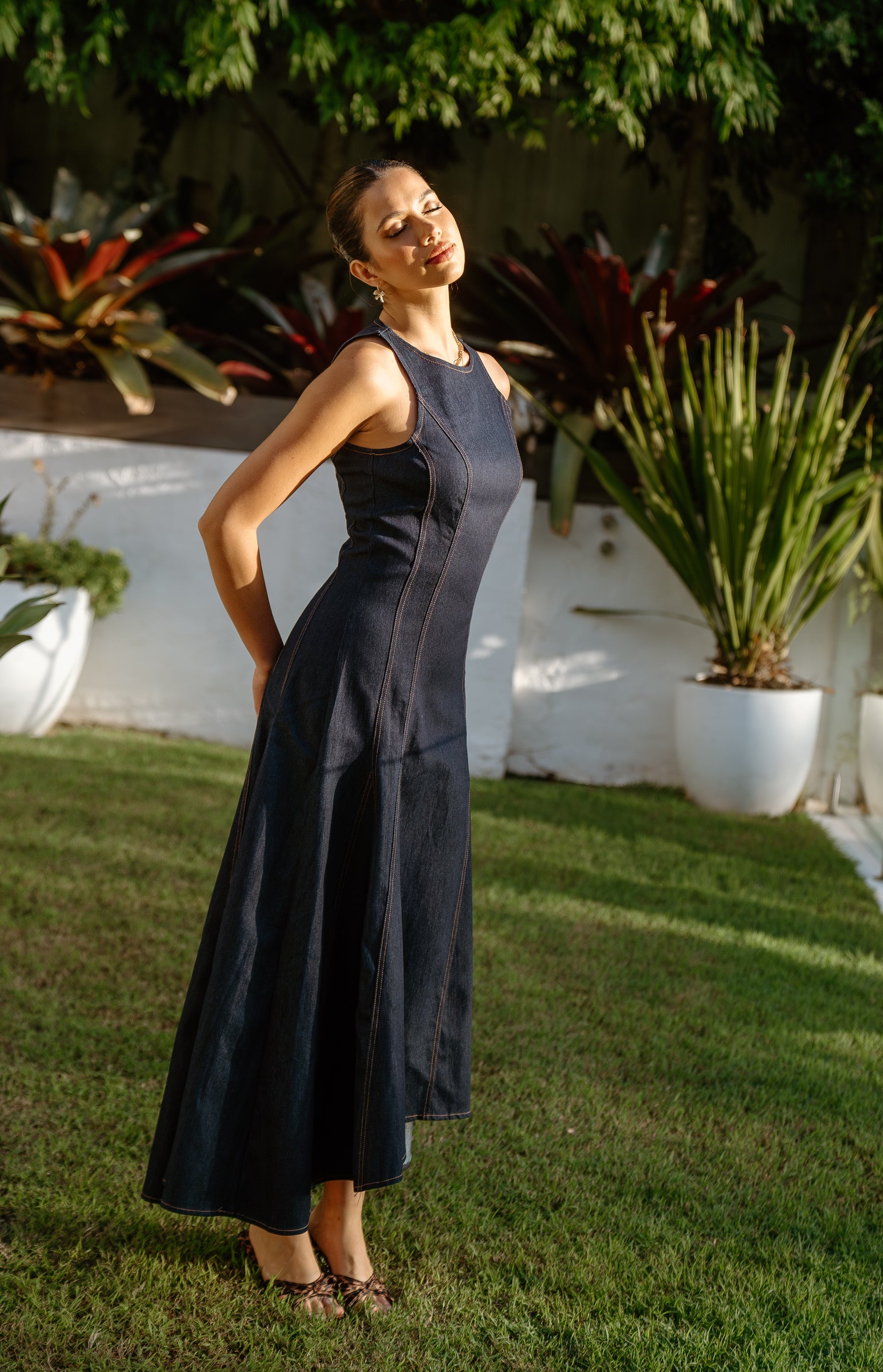Effortless, cool, and made for every season — Demy is your new denim essential. This sleeveless maxi/midi dress is crafted from structured denim with a flattering silhouette that hugs in all the right places. The clean neckline and back zipper create a sleek finish, while the timeless wash makes it easy to dress up or down. Layer it with knits for cooler days or wear it solo in the sun — Delaney was made for transeasonal styling.